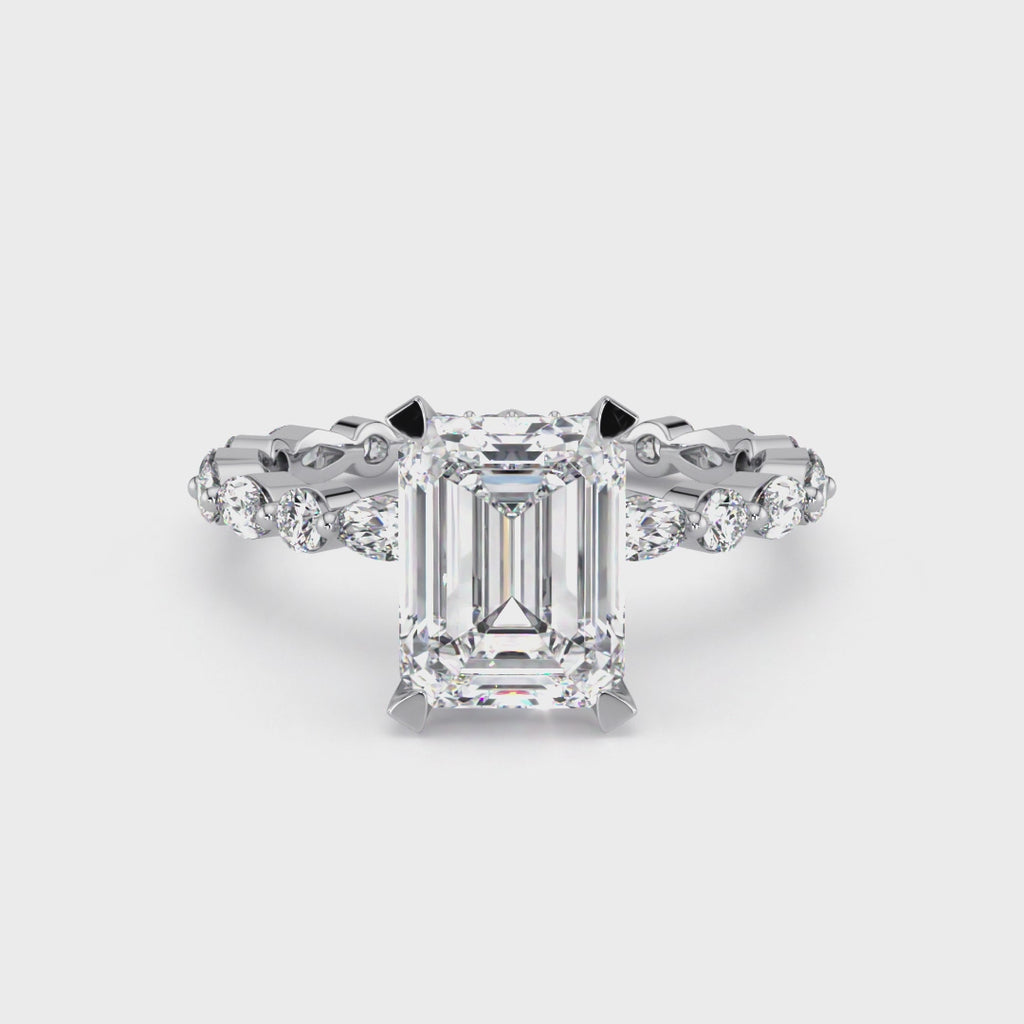 A captivating display of exquisite craftsmanship. The centre holds a dazzling emerald-cut diamond, while the sides are adorned with a breathtaking mix of marquise & round diamonds, resulting in a truly radiant design. Choose Ariel for a one-of-a-kind and captivating symbol of love.