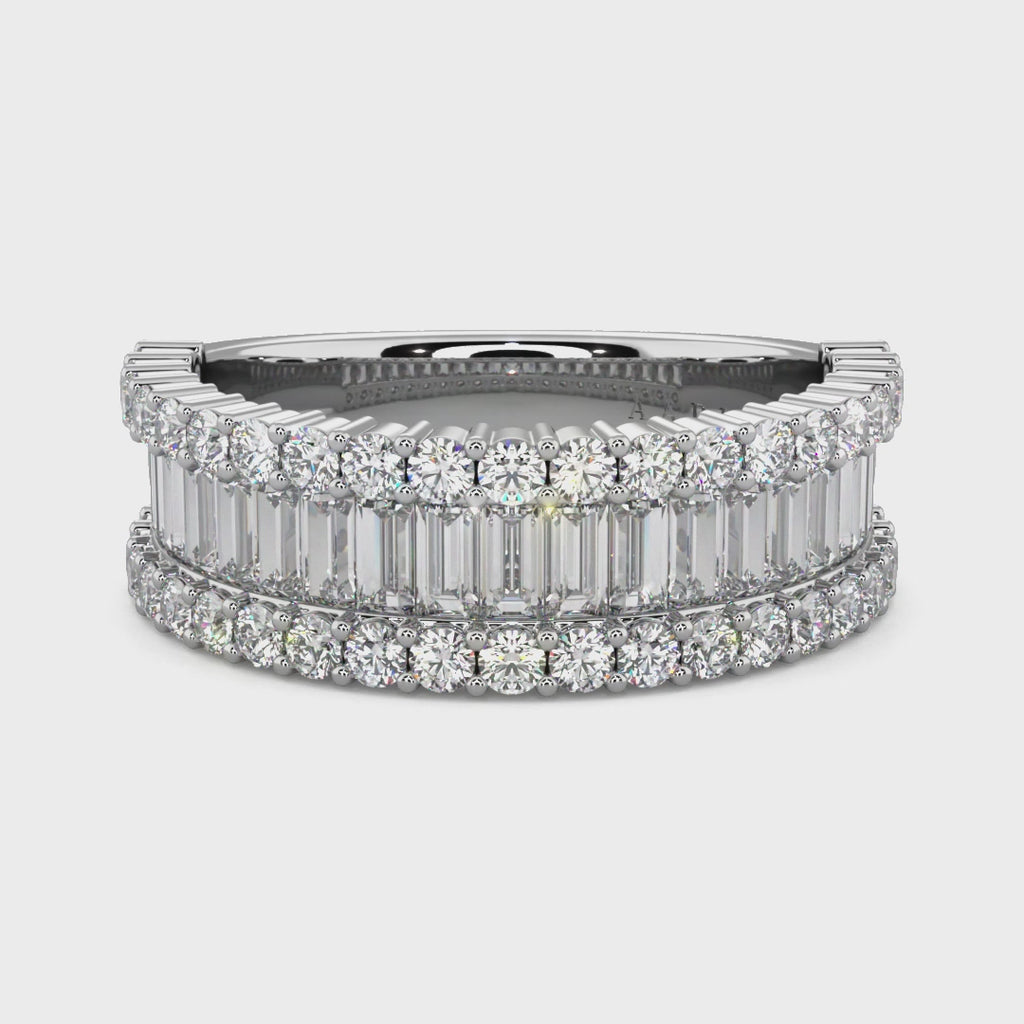 This band showcases three rows of diamonds. The central row of this enchanting band features meticulously set baguette diamonds, their elongated and rectangular facets creating a striking and modern aesthetic. Surrounding the baguette diamonds are two outer rows adorned with brilliant round diamonds. The round diamonds add a touch of brilliance and sparkle, enhancing the overall radiance of the band.