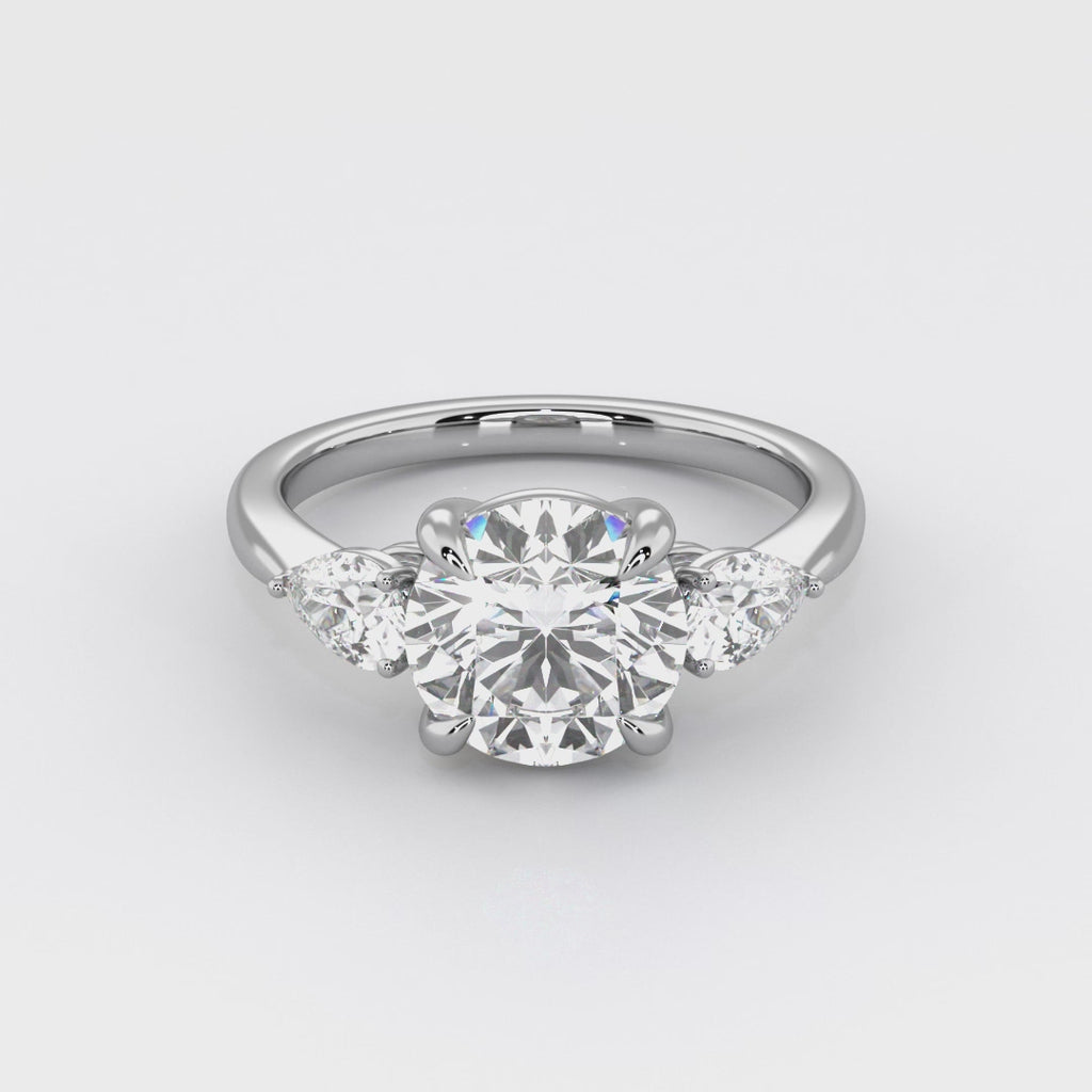 A captivating masterpiece that radiates timeless elegance and sophistication. Crafted with meticulous attention to detail, this enchanting piece features a stunning round trilogy centrepiece, complemented by two resplendent pear-cut diamonds on either side.