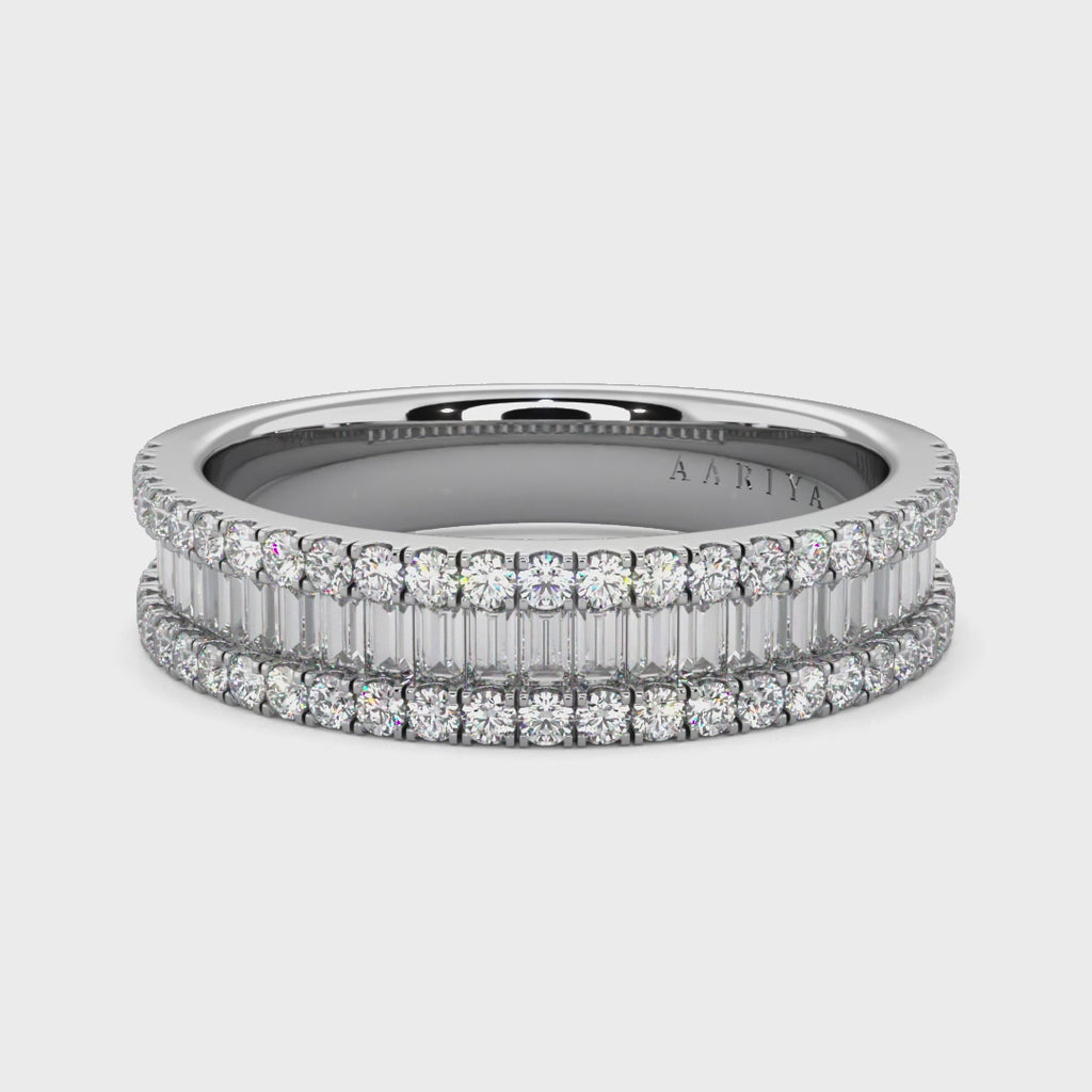 This stunning piece features a three-row design, each intricately adorned with a harmonious blend of baguette and round diamonds.In the centre of this enchanting band lies a captivating row of baguette diamonds, perfectly aligned to create a mesmerising focal point. Surrounding the baguette diamonds on either side are delicate rounds, meticulously set to add a touch of brilliance and classic allure.