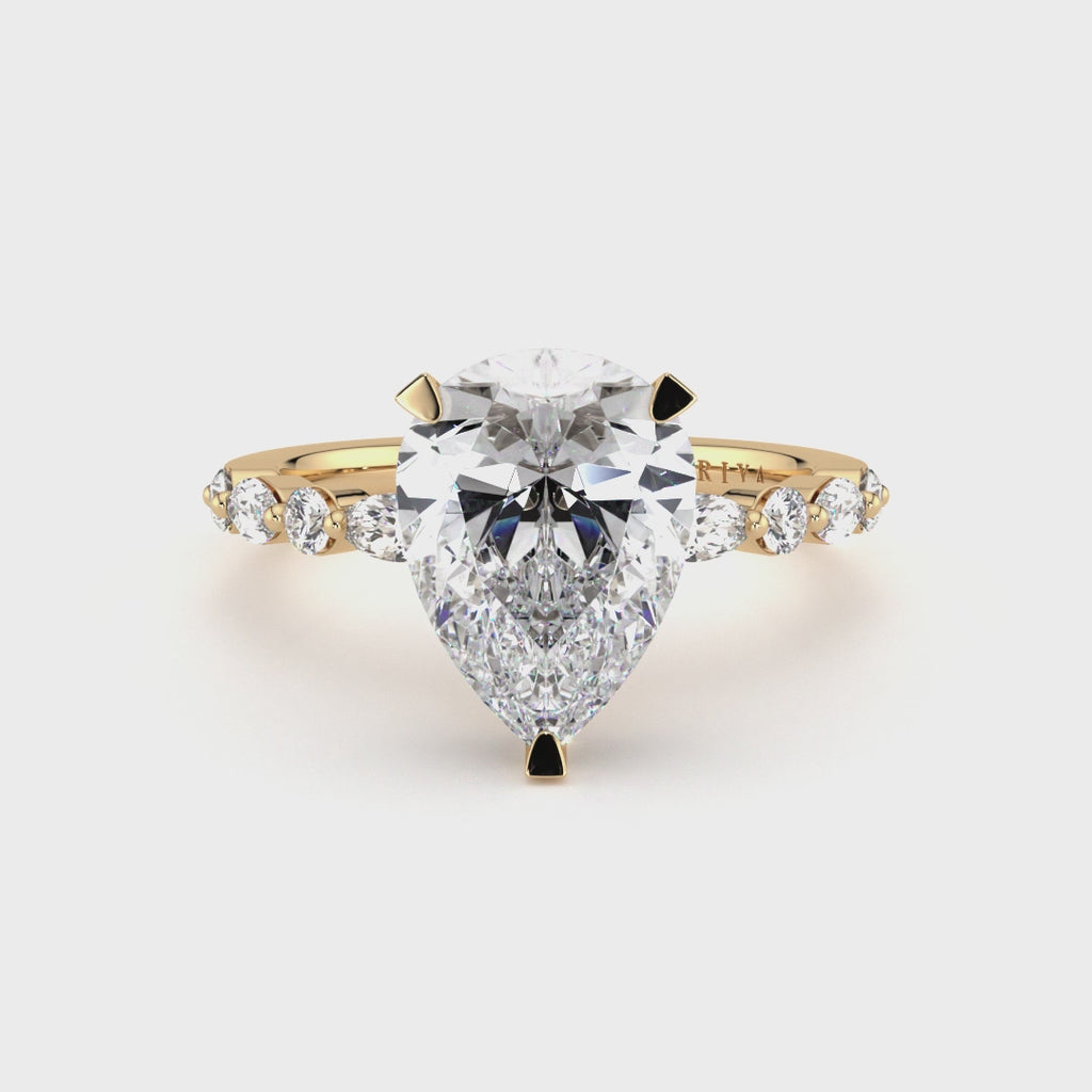 Titania features a brilliant pear diamond, complemented by sparkling round and marquise diamonds covering 50% of the band. Experience the elegance of this design, perfect for symbolising true love and commitment.