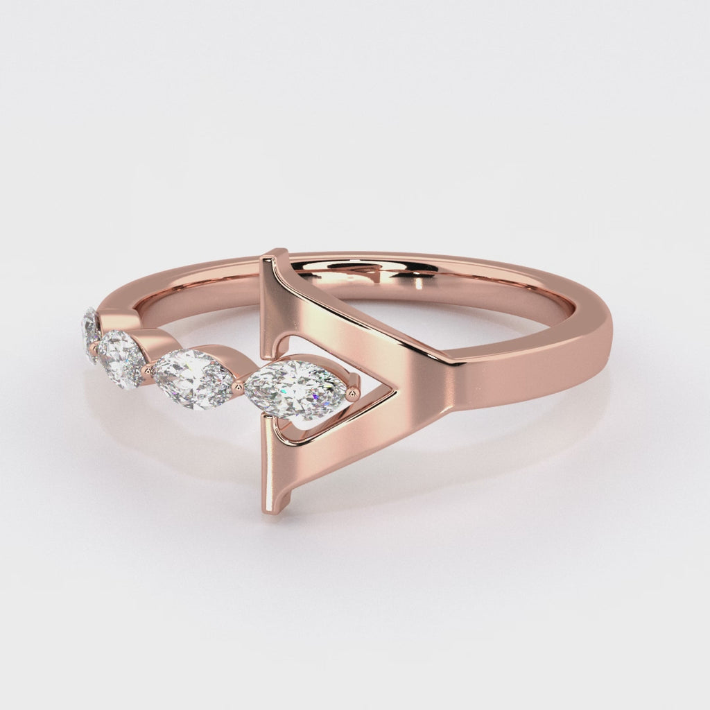 This remarkable piece features a distinctive horizontal rose gold "Y" at its center. The band of the ring showcases a delicate arrangement of marquise diamonds on one side, creating a stunning visual effect that draws the eye and sparks conversation.