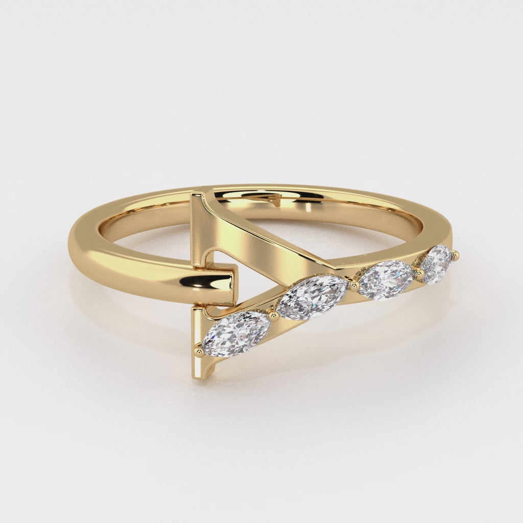 Crafted from lustrous 18ct yellow gold, this exquisite ring showcases a captivating horizontal "Y" design at its centre. The "Y" shape is elegantly adorned with a graceful arrangement of marquise-cut diamonds that gracefully cascade along one side.