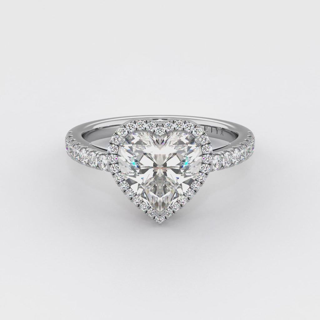 This captivating piece showcases a dazzling heart-shaped diamond at its core, enveloped by a radiant halo of glistening diamonds. Crafted with the utmost care and attention to detail, the Cordelia diamond ring is a testament to the extraordinary beauty that lies within the union of exquisite design and exceptional craftsmanship.
