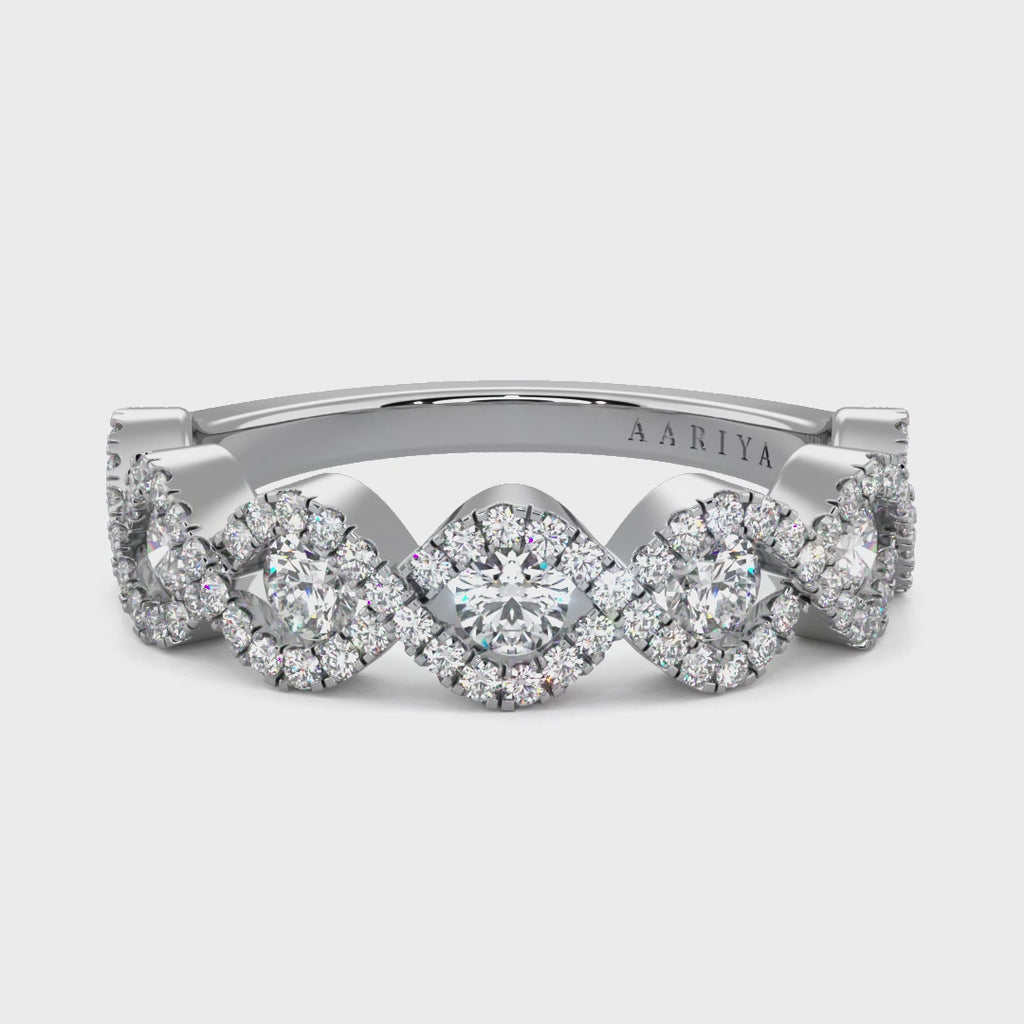 Our crossover design wedding band features a captivating interplay of of round diamonds that intersect. Each crossover has a slightly larger round diamond in the centre for optimal opulence.The careful arrangement of these stones creates a harmonious balance between modern sophistication and traditional elegance.