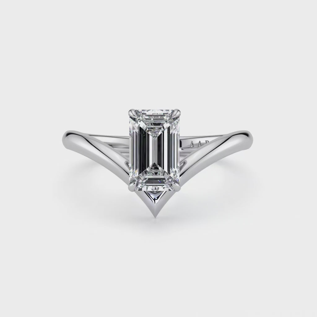 This elegant ring features a stunning emerald cut diamond at its centre, complemented by a gracefully shaped band that enhances its sophisticated appeal. Crafted from your choice of white gold, yellow gold, rose gold, or platinum. This piece offers versatility to suit any preference.