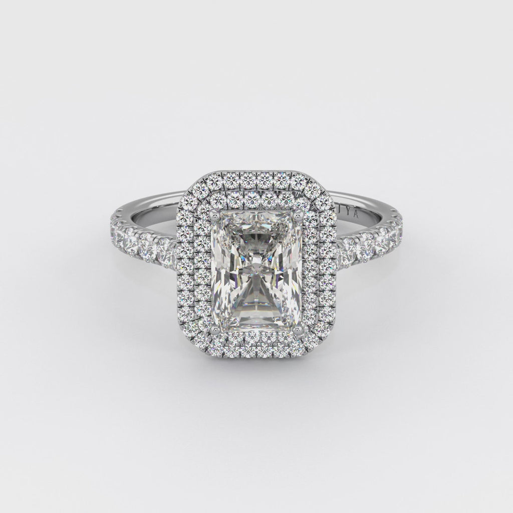 The Esther engagement ring embodies the perfect union of elegance, sophistication, and romance. The centrepiece of this enchanting ring is a radiant cut diamond. Surrounding the centre diamond is a double diamond halo, designed to enhance its brilliance and create a captivating visual display. The halo exudes a sense of opulence and magnificence, adding an extra layer of sparkle and brilliance to the ring.