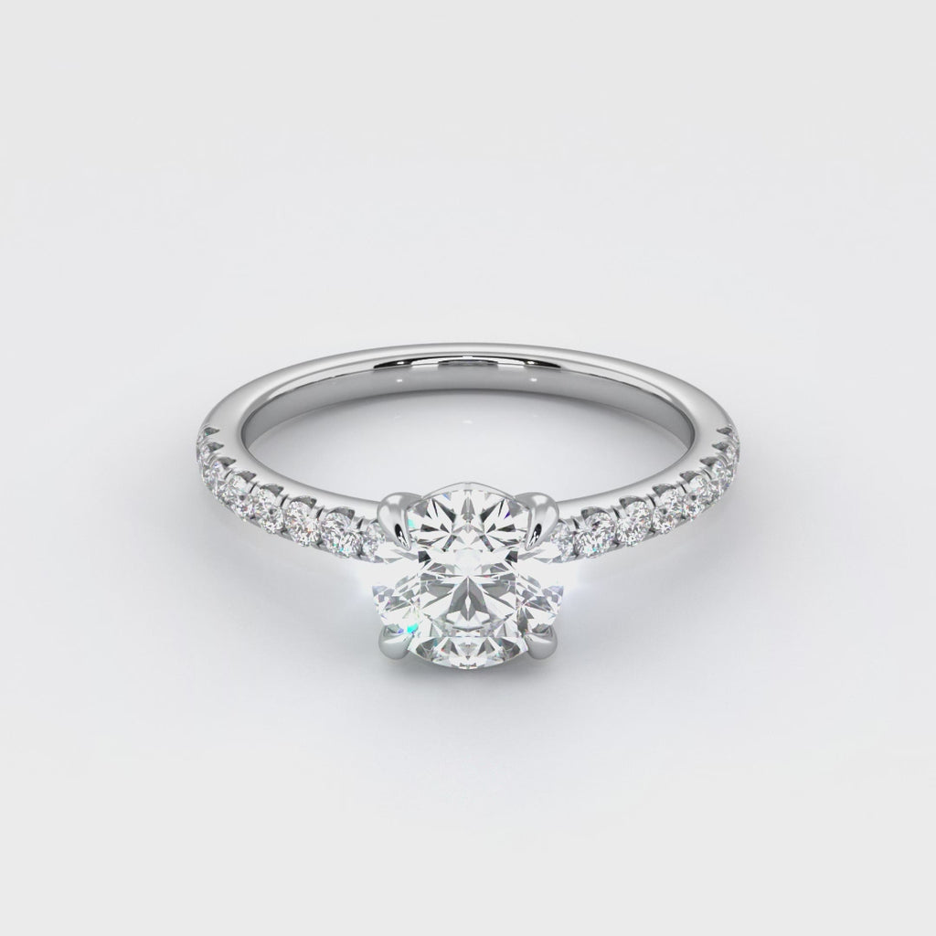 A beautiful round diamond engagement ring, with diamond set shoulders in a 50% setting. This setting is one of the most popular designs simply because of the elegant aesthetic it offers, a round diamond engagement ring has been a staple for many generations and will continue to do so.