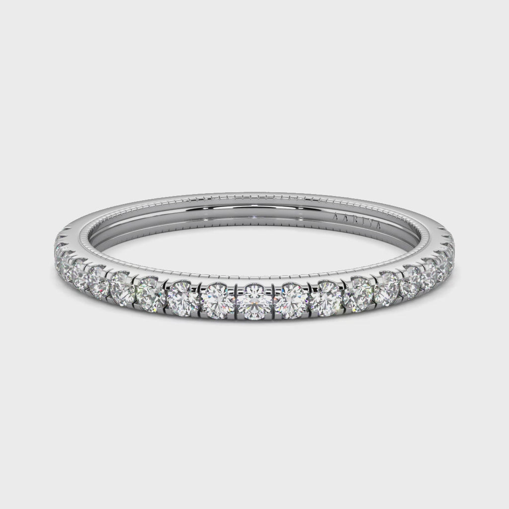 This classic round diamond wedding band is a masterpiece of elegance and sophistication. The band features a continuous row of brilliant round diamonds, each set to create a captivating sparkle. Adding a touch of artistry, the side profile of the ring features a delicate and intricate milgrain design.