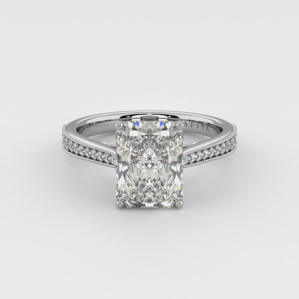 Introducing Nova, a dazzling radiant cut diamond in a tapered out design, set with brilliant diamonds. At the heart of "Nova" lies a radiant cut diamond, sparkling brilliantly from every angle, radiating beauty and elegance.