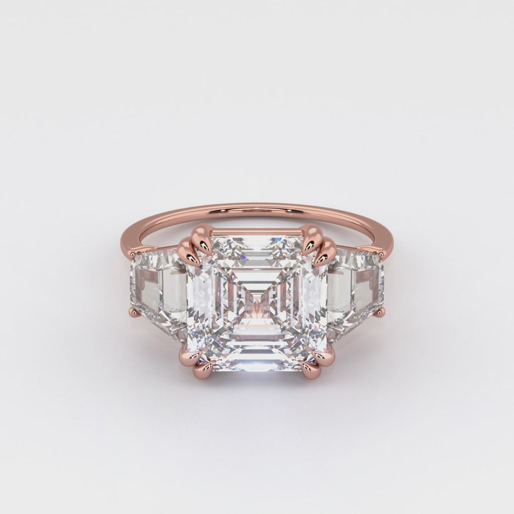 At the heart of this enchanting ring lies a magnificent square Emerald diamond. The Asscher cut, with its distinctive step-cut facets and striking square shape, exudes a captivating allure, reminiscent of vintage glamour and refined taste.