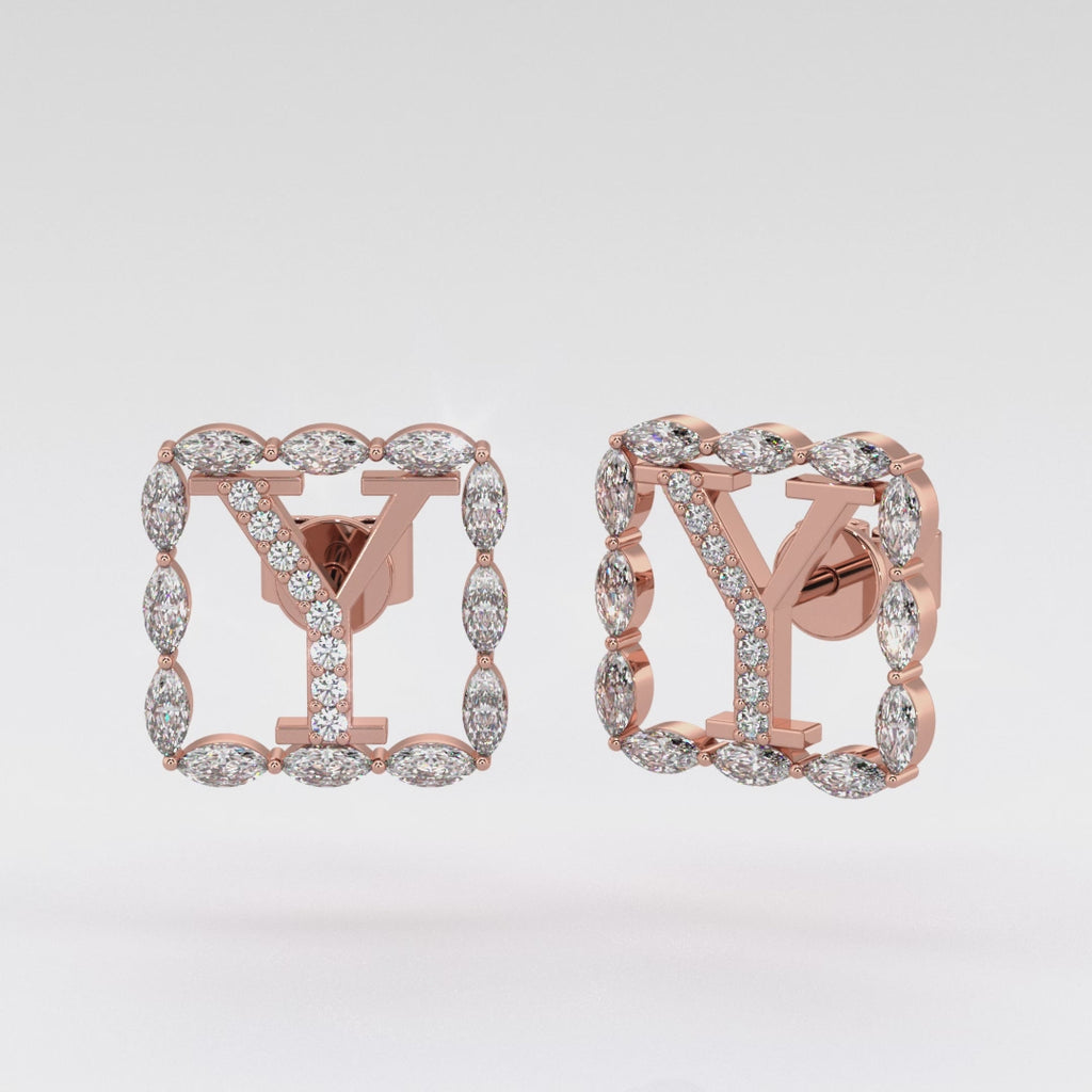Designed for the modern sophisticate, these earrings showcase a captivating "Y" shape at their centre, covered in glistening round diamonds. Encircling this central motif is a square halo, meticulously set with marquise diamonds that radiate a contemporary and sophisticated charm.